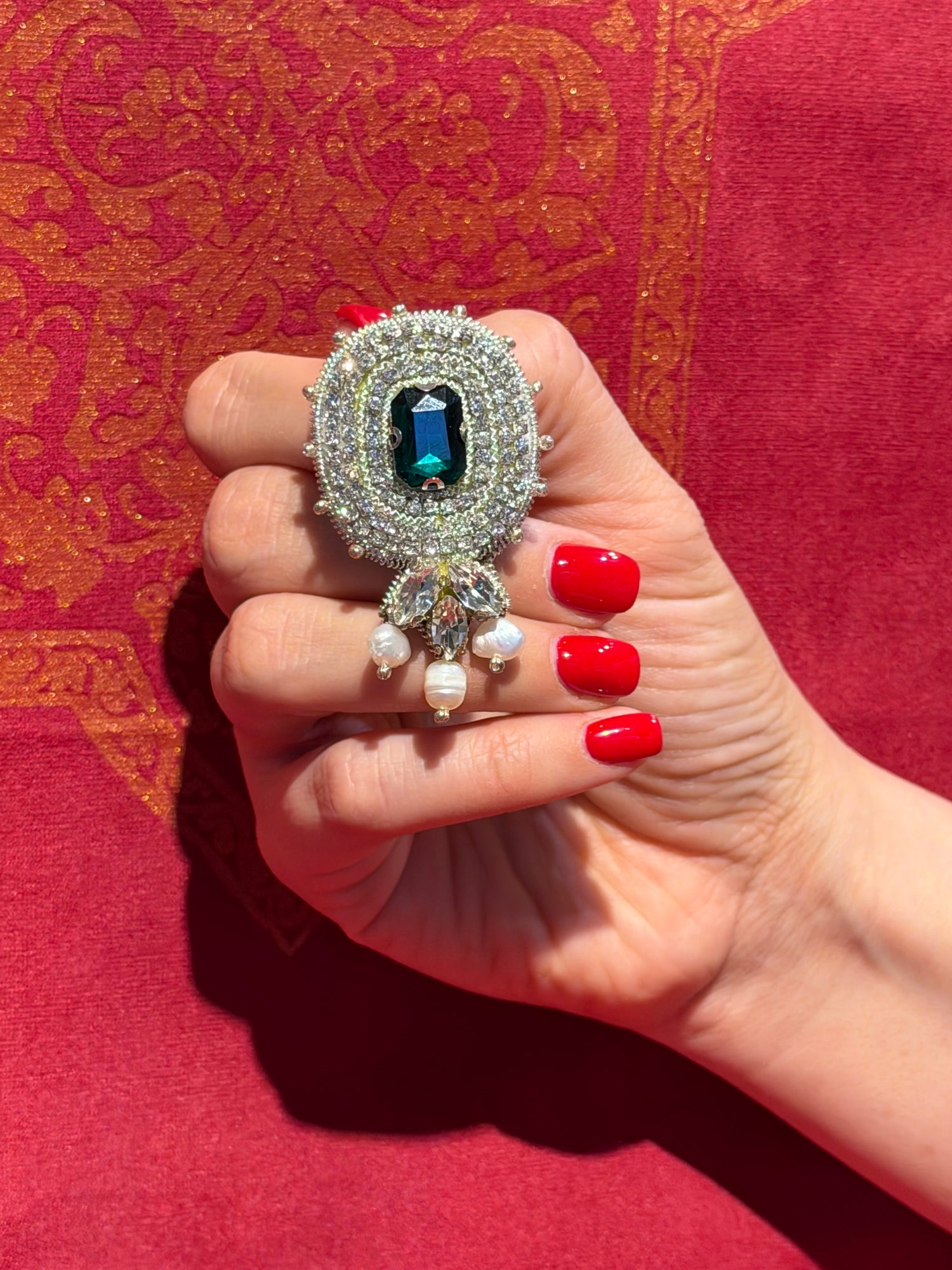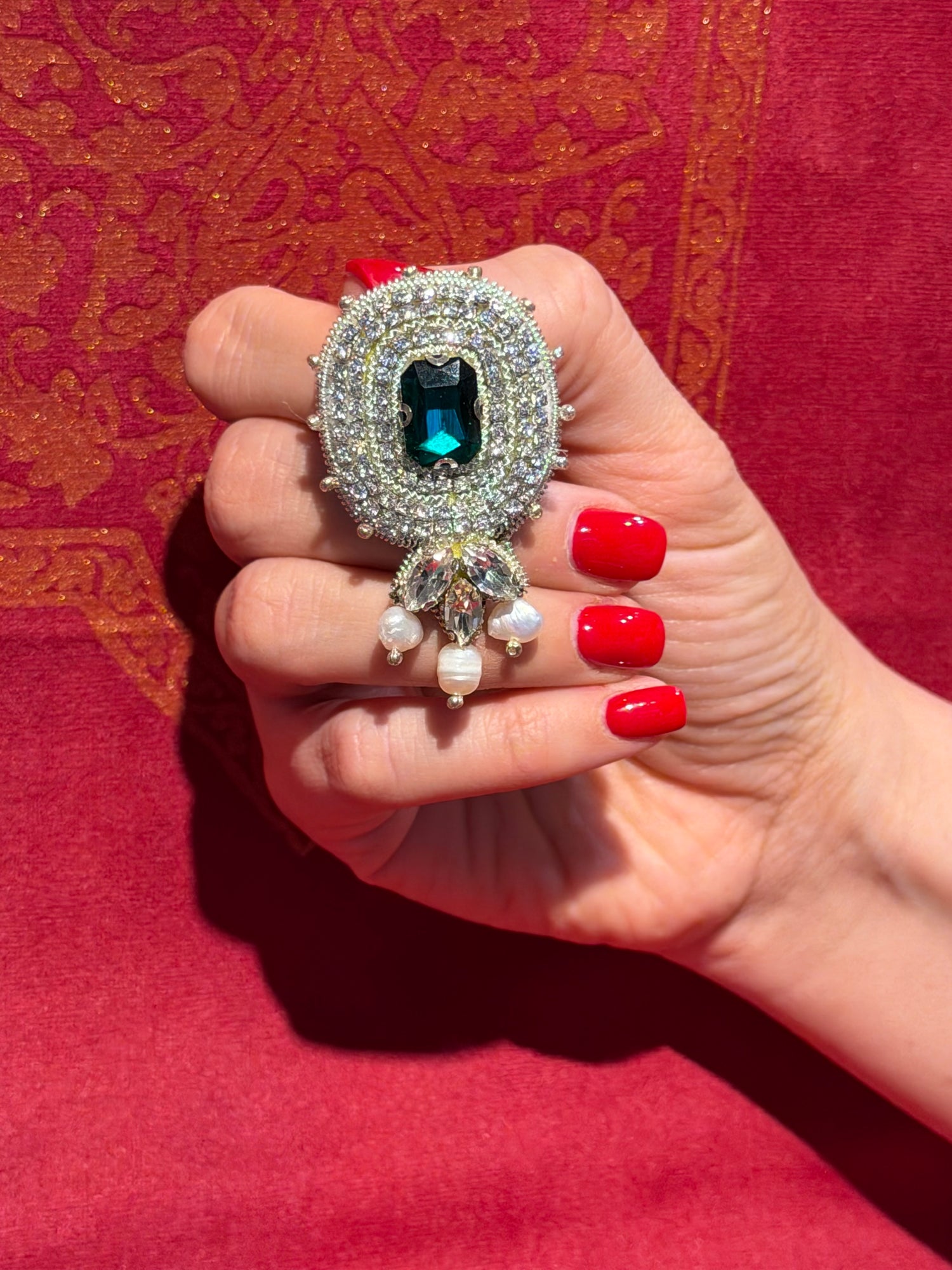 Elegant handcrafted earrings made using traditional Javaherdouzi (jewel embroidery) technique. The design features sparkling crystals, a deep green gemstone centerpiece, and delicate pearl drops that create a luxurious and eye-catching look.