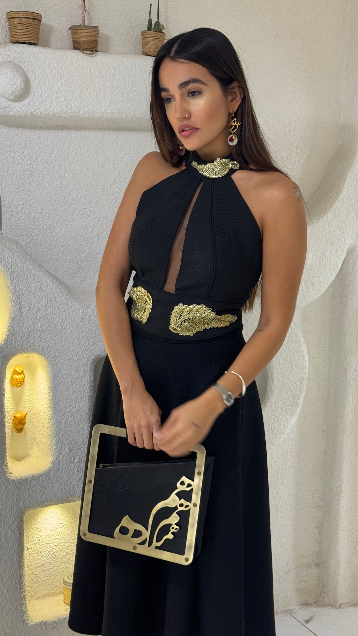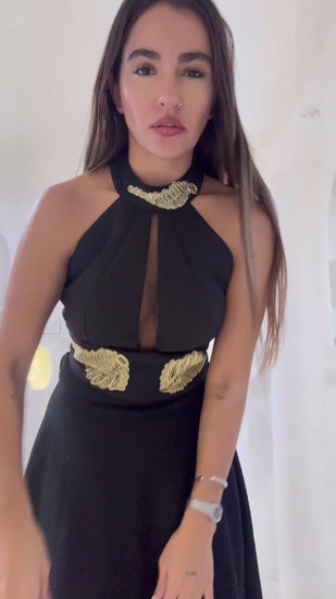 Elegant halter neck top with pleated texture and gold embroidered details. Chic and statement-making, perfect for formal looks.