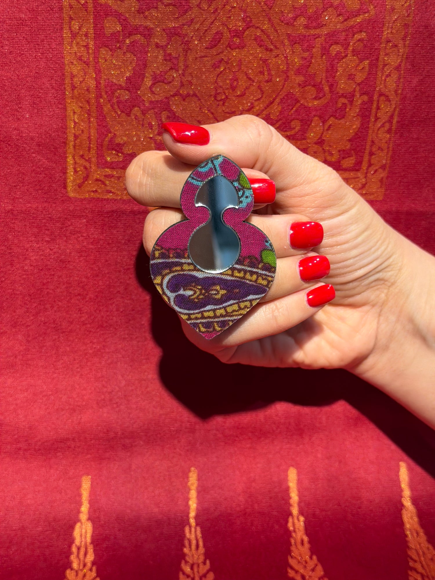 Unique handcrafted earrings made from a combination of mirror and patterned fabric. The reflective mirror detail adds shine, while the traditional fabric design brings color and cultural character to the piece.